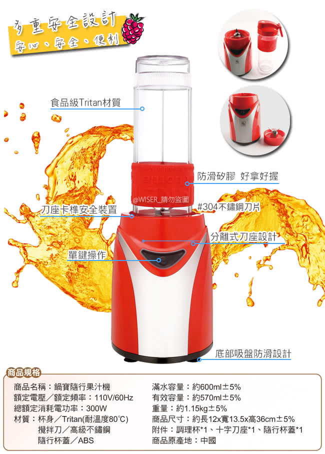 【鍋寶】行動隨身杯果汁機研磨機 SJ-110-D(健康隨身)機器轉動力道強嗎安全嗎操作簡單好上手嗎