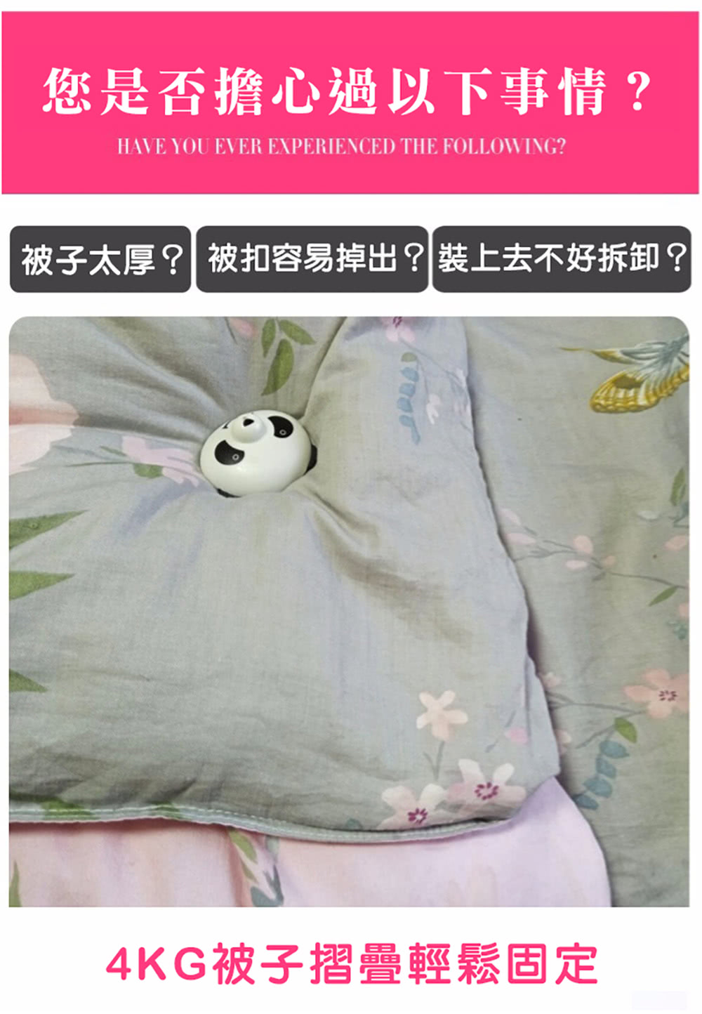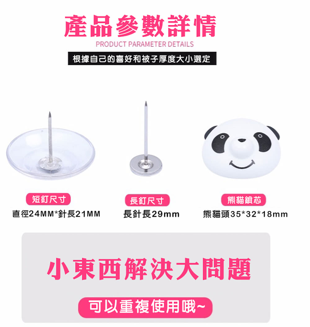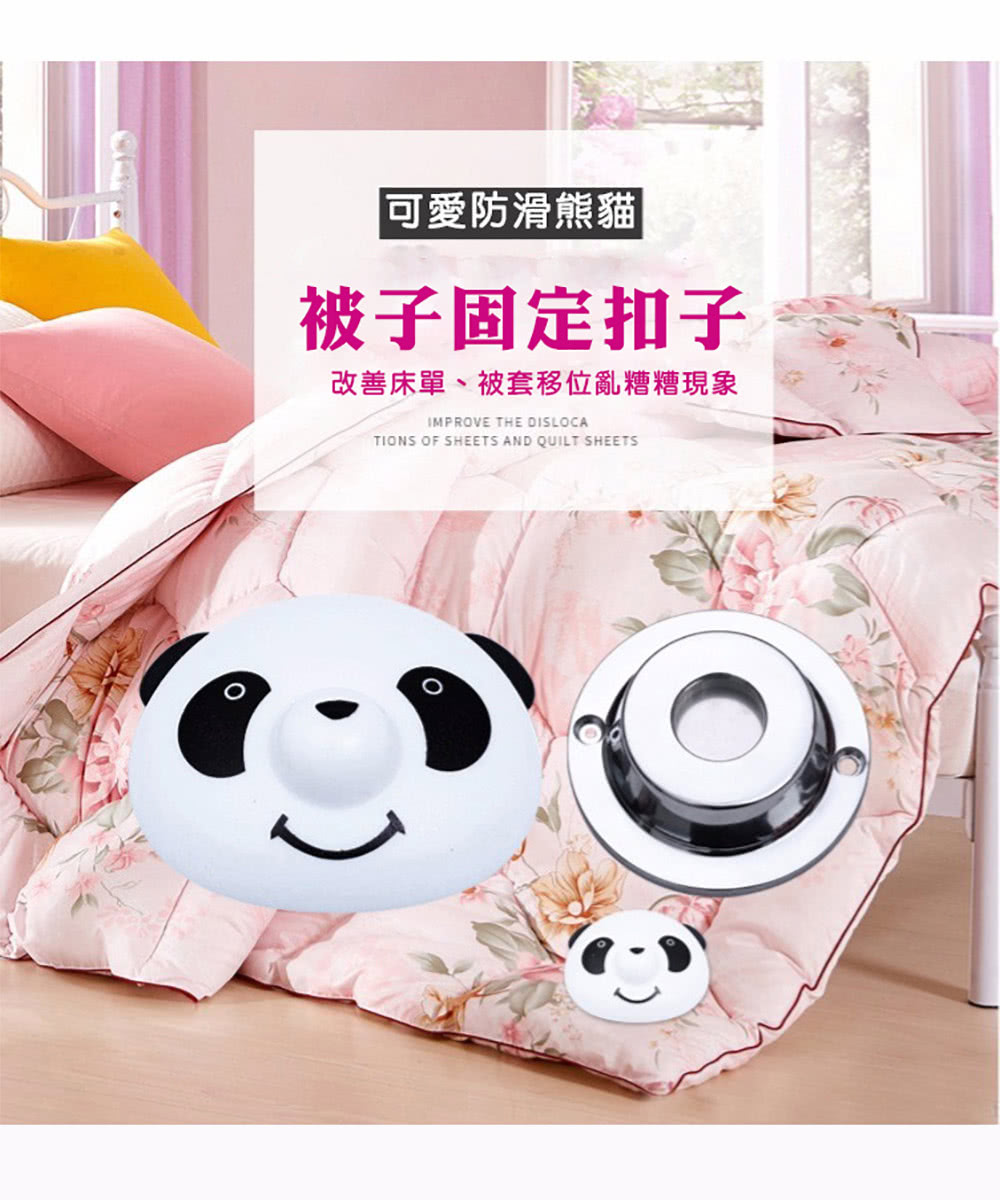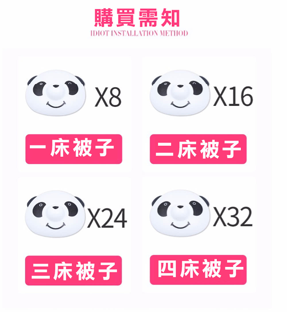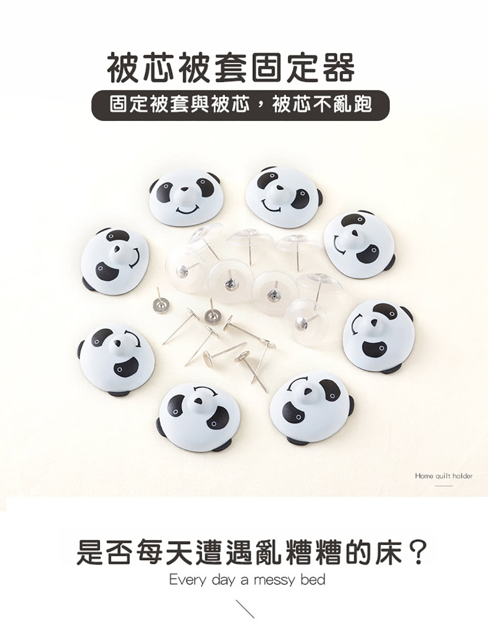 被芯被套防滑固定神器採用可愛熊貓造型,可根據被子的厚薄,選擇使用長針或短針,穿過被芯被套四角和四側中間位置與熊貓頭固定,任你如何翻滾也不滑跑、移位或揉成團;解扣簡單,用強磁解扣器吸住熊貓頭即可分開(B套餐不附解扣器,如需解扣器,請購買A套餐),從此整理被褥更輕鬆!
