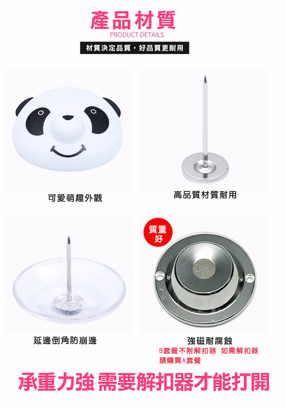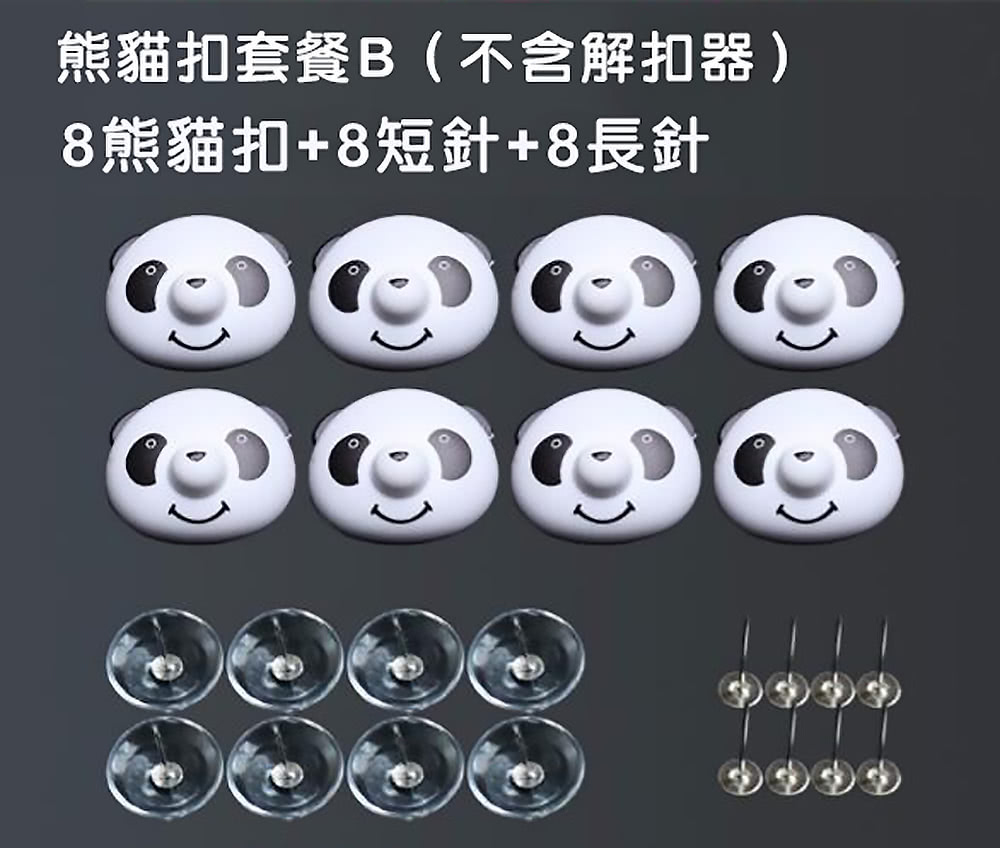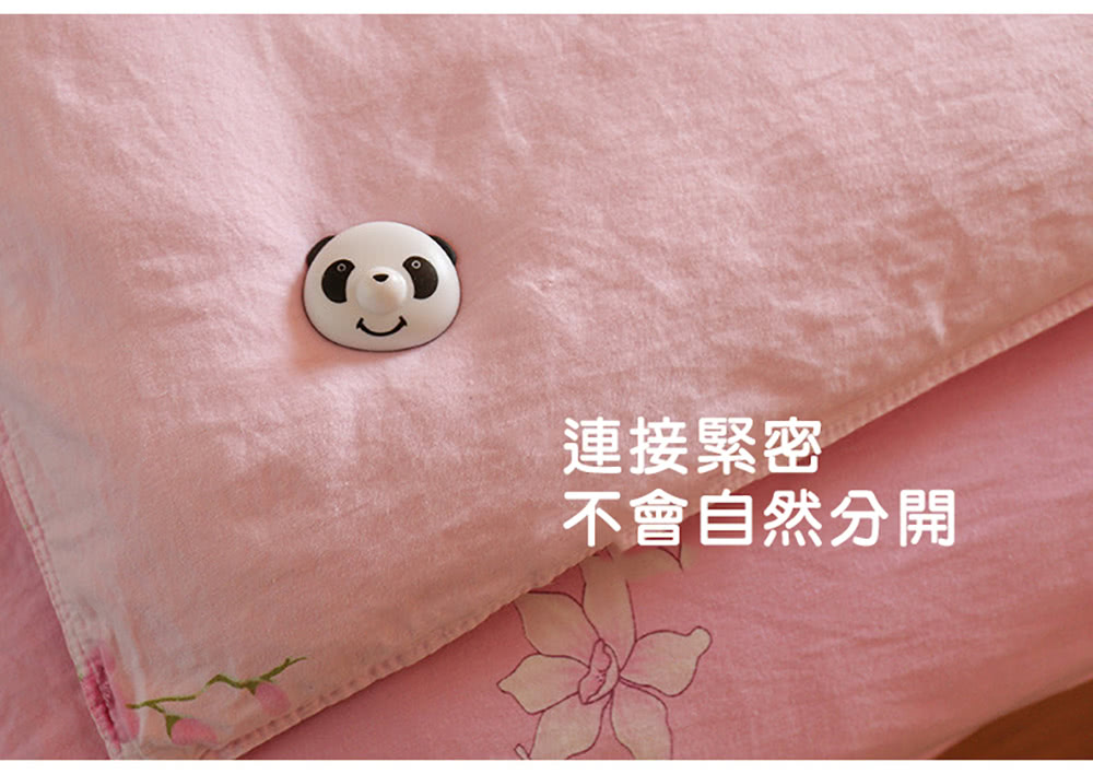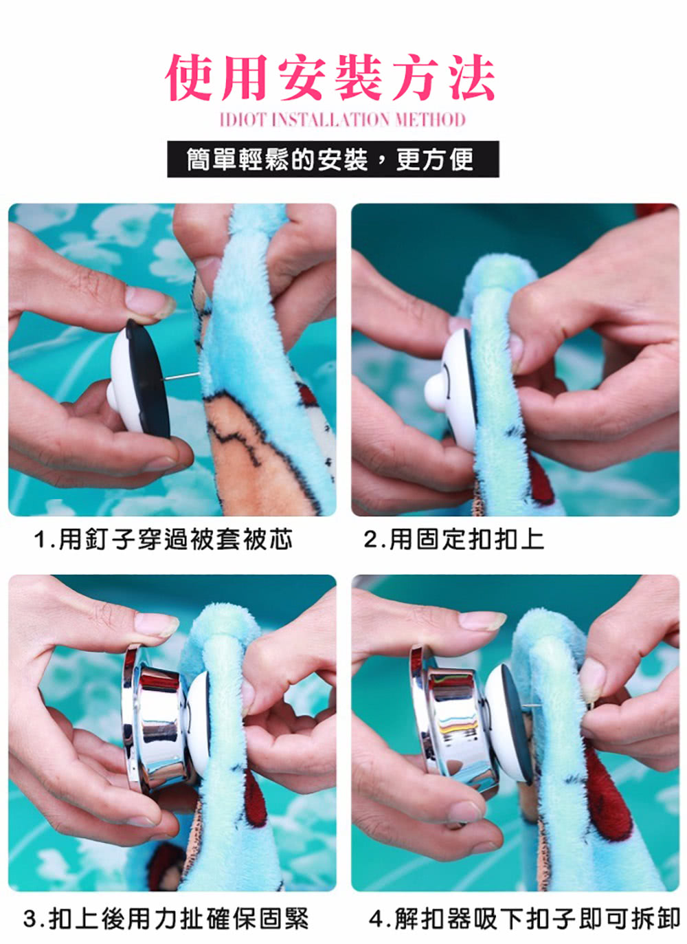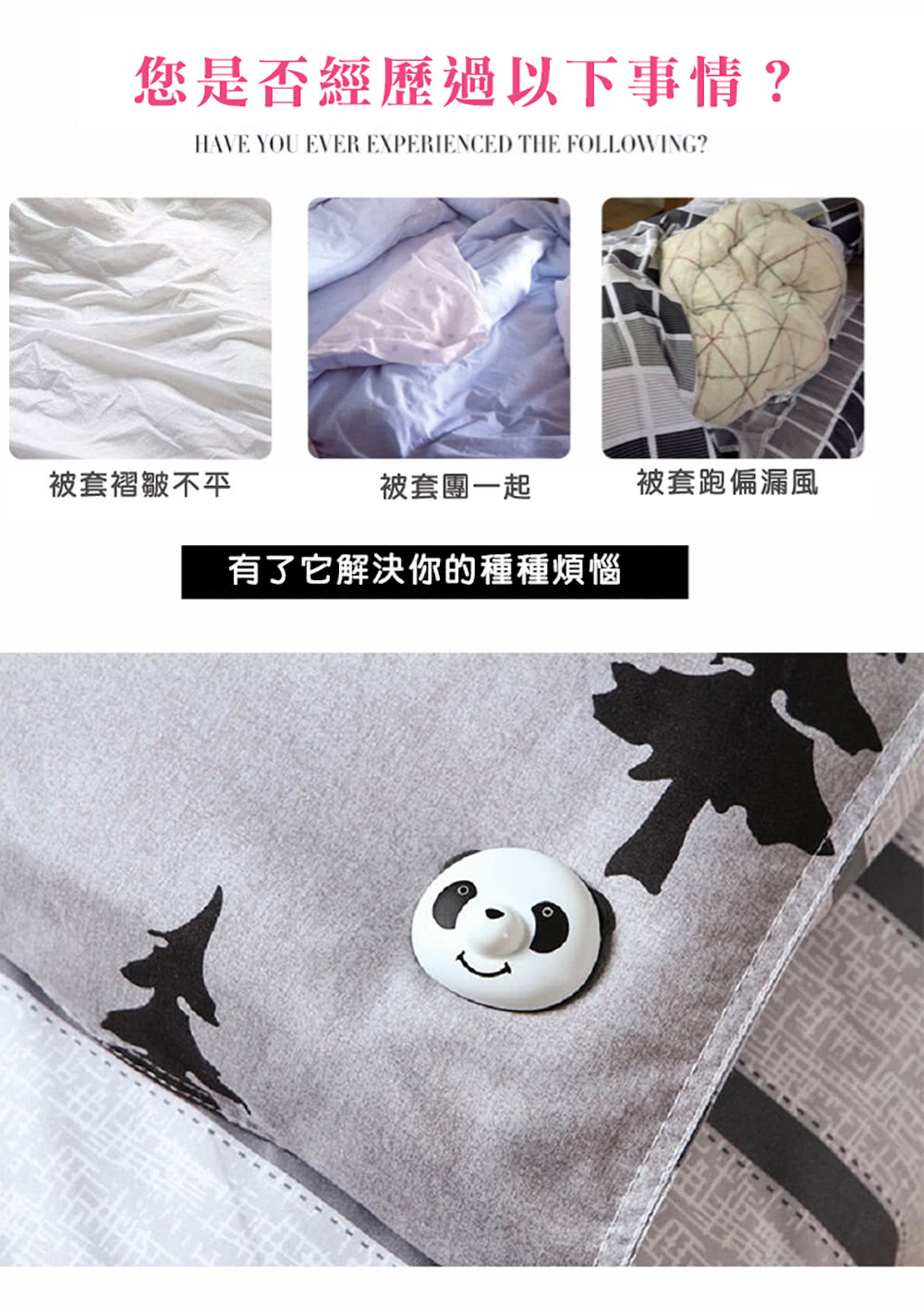 被芯被套防滑固定神器採用可愛熊貓造型,可根據被子的厚薄,選擇使用長針或短針,穿過被芯被套四角和四側中間位置與熊貓頭固定,任你如何翻滾也不滑跑、移位或揉成團;解扣簡單,用強磁解扣器吸住熊貓頭即可分開(B套餐不附解扣器,如需解扣器,請購買A套餐),從此整理被褥更輕鬆!